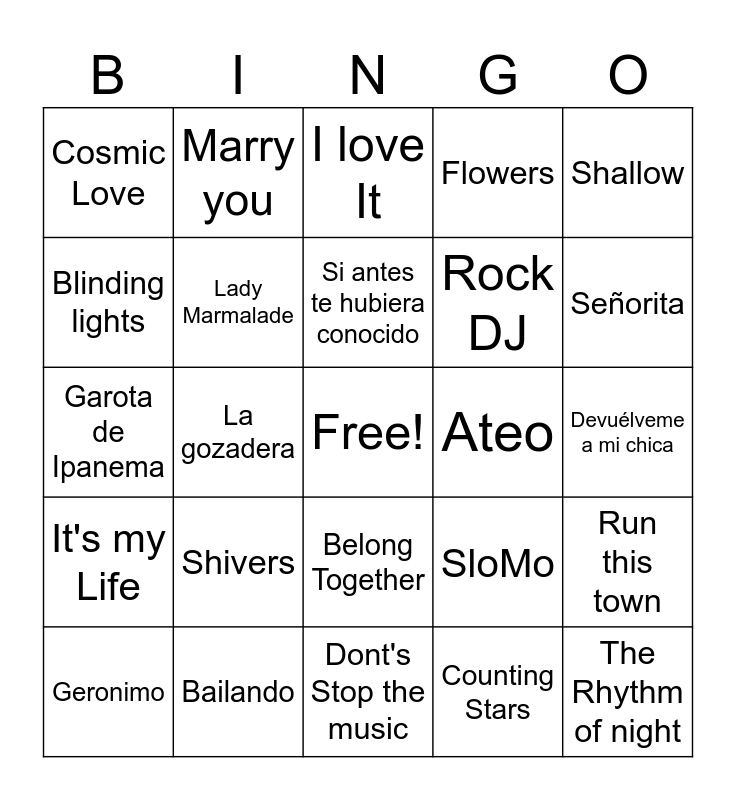 This bingo card has a free space and 101 words: Wannabe, Single Ladies, Shallow, I'll be there for you, Toxic, Mamma Mia, Umbrella, Don't go breaking my heart, I Gotta Feeling, Mr. Brightside, Suerte (Whenever, Wherever), Summer Nights, Viva la vida, Uptown Funk, Barbie Girl, Don't Stop me now, It's my Life, Oh, Pretty Woman, Shape of you, Sarà perché ti amo, Sweet Caroline, Everybody, Houdini, Dance the night, Shake it off, Señorita, Flowers, Shivers, Despechá, Made you look, Marry you, I love It, On top of the World, What Makes you beautiful, All I want for Christmas is you, Belong Together, Billie Jean, Sweet Dreams, Counting Stars, Dont's Stop the music, Summer, Geronimo, feelslikeimfallinginlove, APT., The final Countdown, The Rhythm of night, Freed from desire, Texas Hold'em, Pepas, Don't go Yet, Rasputin, Blinding lights, Voulez-Vous, I'm still standing, Hey, Soul Sister, Womanizer, Tik Tok, Can't stop the Feeling, this is the life, Where have you been, Lady Marmalade, When Love Takes over, Summercat, Let's get loud, i like the way you kiss me, Rock DJ, Poker Face, La gozadera, Bailando, Ai se eu te pego, Macarena, Despacito, Cosmic Love, Love on the Brain, Si antes te hubiera conocido, Garota de Ipanema, Danza Kuduro, Moves Like Jagger, Vagabundo, Gimme! Gimme! Gimme!, Bailando, Vivir mi vida, Ateo, Bzrp Music Session, Corazón Partío, Rosas, Devuélveme a mi chica, La bachata, Me colé en una fiesta, Mon Amour, SloMo, Un año más, El fin del mundo, Jingle Bell Rock, Unwritten, Run this town, Beggin', La Bilirrubina, Ave María, Tú me dejaste de querer and Vaina loca.