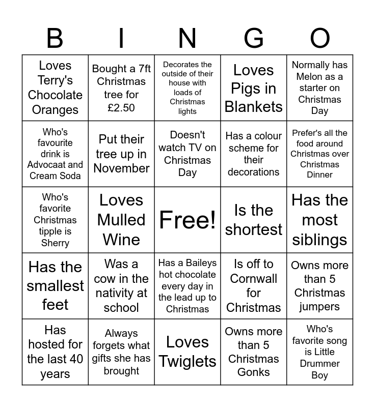 This bingo card has a free space and 49 words: Has 5 pairs of Christmas PJ's, Who's favorite song is Little Drummer Boy, Favourite Christmas Cocktail is a Twinkle, Loves Twiglets, Was a cow in the nativity at school, Doesn't put decorations up until after 15th Dec, Bought a 7ft Christmas tree for £2.50, Loves singing O Come All Ye Faithful, Who's favourite drink is Advocaat and Cream Soda, Who's never tried Eggnog, Put their tree up in November, Loves Pigs in Blankets, Owns more than 5 Christmas jumpers, Is off to Cornwall for Christmas, Owns more Christmas Socks than regular socks, Likes to be near water on Christmas Day, Doesn't watch TV on Christmas Day, Is the shortest, Has a real Christmas Tree, Normally has Melon as a starter on Christmas Day, Loves Mulled Wine, Owns more than 5 Christmas Gonks, Loves Terry's Chocolate Oranges, Has a colour scheme for their decorations, Still circles the TV Movies they plan to watch in the Christmas Radio Times, Prefer's all the food around Christmas over Christmas Dinner, Has hosted for the last 40 years, Who’s never gone out on Christmas Eve, Has a Baileys hot chocolate every day in the lead up to Christmas, Has the smallest feet, Loves Brussel Sprouts, Has homemade sausage rolls for breakfast every Christmas, Normally makes the starter for Christmas Dinner, Goes to Church on Christmas Eve, Always forgets what gifts she has brought, Does not like mince pies, Christmas cake or Christmas pudding!, Hasn't done any Christmas Shopping, Actually enjoys Christmas music, Has the most siblings, Doesn't send Christmas Cards, Is having two Christmas Days this year, Was Born in December, Who's favorite tree ornament was brought by a colleague, Is wearing red or green nail polish, Who's favorite Christmas tipple is Sherry, Decorates the outside of their house with loads of Christmas lights, Buys a Christmas decoration wherever they go on Holiday, Never has to do Christmas with the in laws and Loves to spend Christmas sitting by the fire with a baileys and good book.