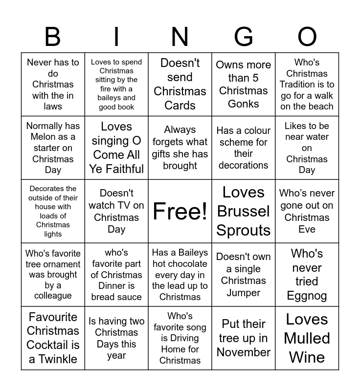 This bingo card has a free space and 47 words: Who's favorite Christmas tipple is Sherry, Loves Mulled Wine, Hasn't done any Christmas Shopping, Who's favorite song is Driving Home for Christmas, who's favorite part of Christmas Dinner is bread sauce, Was Born in December, Loves to spend Christmas sitting by the fire with a baileys and good book, Prefer's all the food around Christmas over Christmas Dinner, Normally has Melon as a starter on Christmas Day, Loves Terry's Chocolate Oranges, Loves singing O Come All Ye Faithful, Owns more than 5 Christmas Gonks, Who's never tried Eggnog, Doesn't own a single Christmas Jumper, Has the smallest feet, Normally makes the starter for Christmas Dinner, Always forgets what gifts she has brought, Loves Brussel Sprouts, Bought a 7ft Christmas tree for £2.50, Who's Christmas Tradition is to go for a walk on the beach, Doesn't watch TV on Christmas Day, Put their tree up in November, Never has to do Christmas with the in laws, Has a colour scheme for their decorations, Was a cow in the nativity at school, Likes to be near water on Christmas Day, Favourite Christmas Cocktail is a Twinkle, Has a real Christmas Tree, Has a Baileys hot chocolate every day in the lead up to Christmas, Who's favorite tree ornament was brought by a colleague, Who's favorite song is Little Drummer Boy, Owns more than 5 Christmas jumpers, Still circles the TV Movies they plan to watch in the Christmas Radio Times, Doesn't put decorations up until after 15th Dec, Is wearing red or green nail polish, Is having two Christmas Days this year, Who’s never gone out on Christmas Eve, Has homemade sausage rolls for breakfast every Christmas, Actually enjoys Christmas music, Who's favourite drink is Advocaat and Cream Soda, Buys a Christmas decoration wherever they go on Holiday, Doesn't send Christmas Cards, Decorates the outside of their house with loads of Christmas lights, Is off to Cornwall for Christmas, Loves Pigs in Blankets, Has 5 pairs of Christmas PJ's and Has hosted for the last 40 years.