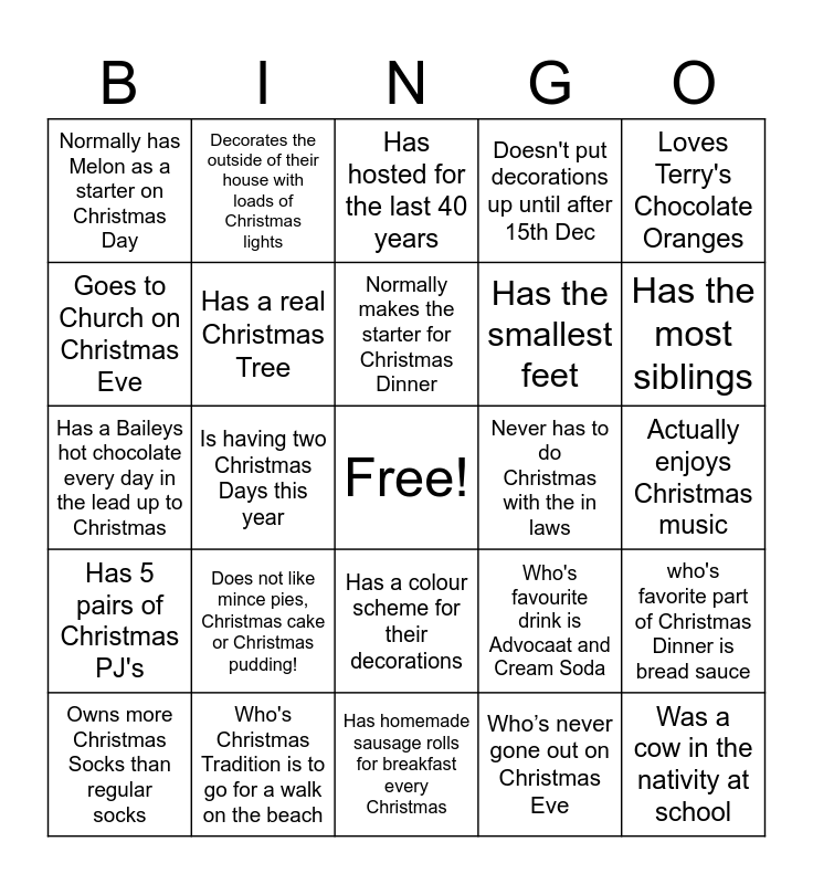 This bingo card has a free space and 48 words: Put their tree up in November, Was a cow in the nativity at school, Doesn't send Christmas Cards, Has homemade sausage rolls for breakfast every Christmas, Does not like mince pies, Christmas cake or Christmas pudding!, Buys a Christmas decoration wherever they go on Holiday, Decorates the outside of their house with loads of Christmas lights, Loves Brussel Sprouts, Goes to Church on Christmas Eve, Prefer's all the food around Christmas over Christmas Dinner, Has a real Christmas Tree, Doesn't put decorations up until after 15th Dec, who's favorite part of Christmas Dinner is bread sauce, Who's favourite drink is Advocaat and Cream Soda, Bought a 7ft Christmas tree for £2.50, Owns more than 5 Christmas Gonks, Normally makes the starter for Christmas Dinner, Never has to do Christmas with the in laws, Who's never tried Eggnog, Loves Terry's Chocolate Oranges, Is having two Christmas Days this year, Who’s never gone out on Christmas Eve, Normally has Melon as a starter on Christmas Day, Has the smallest feet, Owns more than 5 Christmas jumpers, Has the most siblings, Owns more Christmas Socks than regular socks, Doesn't own a single Christmas Jumper, Has a colour scheme for their decorations, Has 5 pairs of Christmas PJ's, Was Born in December, Is wearing red or green nail polish, Who's favorite song is Little Drummer Boy, Is off to Cornwall for Christmas, Who's Christmas Tradition is to go for a walk on the beach, Who's favorite tree ornament was brought by a colleague, Who's favorite song is Driving Home for Christmas, Actually enjoys Christmas music, Doesn't watch TV on Christmas Day, Likes to be near water on Christmas Day, Still circles the TV Movies they plan to watch in the Christmas Radio Times, Hasn't done any Christmas Shopping, Has hosted for the last 40 years, Favourite Christmas Cocktail is a Twinkle, Has a Baileys hot chocolate every day in the lead up to Christmas, Who's favorite Christmas tipple is Sherry, Loves Pigs in Blankets and Loves to spend Christmas sitting by the fire with a baileys and good book.