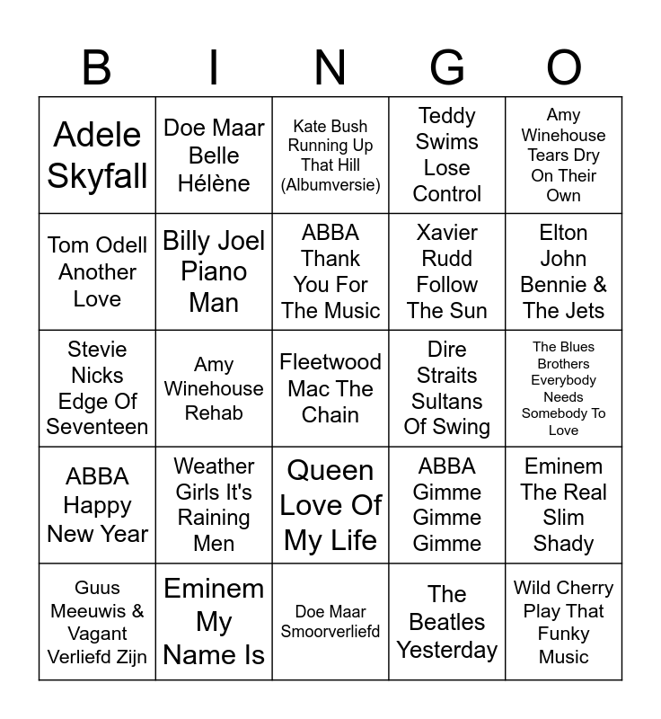 This bingo card has 36 words: Free!, Eagles Hotel California, ABBA Chiquitita, Billy Joel Piano Man, ABBA Gimme Gimme Gimme, ABBA Happy New Year, ABBA Thank You For The Music, ABBA Money Money Money, Amy Winehouse Tears Dry On Their Own, Amy Winehouse Back To Black, Amy Winehouse Rehab, Teddy Swims Lose Control, Imagine Dragons Enemy, Dire Straits Sultans Of Swing, Elton John Bennie & The Jets, Adele Skyfall, Wild Cherry Play That Funky Music, Weather Girls It's Raining Men, Fleetwood Mac The Chain, Kate Bush Running Up That Hill (Albumversie), The Blues Brothers Everybody Needs Somebody To Love, Eminem The Real Slim Shady, Eminem My Name Is, Guus Meeuwis & Vagant Verliefd Zijn, Doe Maar Smoorverliefd, Doe Maar Belle Hélène, Stevie Nicks Edge Of Seventeen, The Beatles Eleanor Rigby, Xavier Rudd Follow The Sun, Tom Odell Another Love, Amy MacDonald This Is The Life, Ike & Tina Turner Proud Mary, The Beatles Yesterday, Queen Love Of My Life, The Offspring Pretty Fly (For A White Guy) and Queen Bohemian Rhapsody.