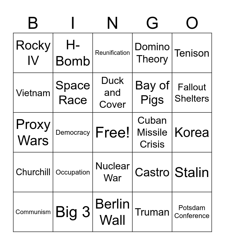 This bingo card has a free space and 24 words: Occupation, Big 3, Duck and Cover, Communism, Tenison, Rocky IV, Vietnam, H-Bomb, Cuban Missile Crisis, Nuclear War, Bay of Pigs, Proxy Wars, Castro, Stalin, Space Race, Truman, Korea, Reunification, Fallout Shelters, Democracy, Potsdam Conference, Churchill, Domino Theory and Berlin Wall.