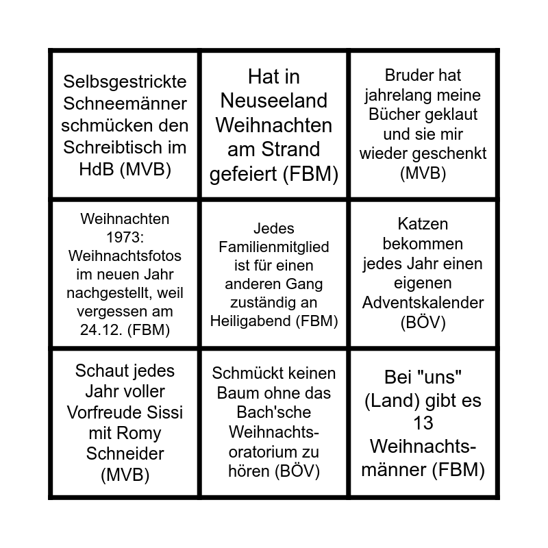 This bingo card has 15 words: Singt an Weihnachten mit der Familie (FBM), Vater hat an Weihnachten gebrannt & selbst mit Bier gelöscht (FBM), Bruder hat jahrelang meine Bücher geklaut und sie mir wieder geschenkt (MVB), Selbsgestrickte Schneemänner schmücken den Schreibtisch im HdB (MVB), Schmückt keinen Baum ohne das Bach'sche Weihnachts-oratorium zu hören (BÖV), Jedes Familienmitglied ist für einen anderen Gang zuständig an Heiligabend (FBM), Christkind kam schon Mal zur Bescherung an die Autobahn-raststätte (Mediac.), Hat bei 35 Grad Glühwein in Botswana getrunken (FBM), Katzen bekommen jedes Jahr einen eigenen Adventskalender (BÖV), Bei "uns" (Land) gibt es 13 Weihnachts-männer (FBM), Familie kocht jedes Weihnachten ein Menü eines anderen Landes (MVB), Weihnachten 1973: Weihnachtsfotos im neuen Jahr nachgestellt, weil vergessen am 24.12. (FBM), Schaut jedes Jahr voller Vorfreude Sissi mit Romy Schneider (MVB), Hat in Neuseeland Weihnachten am Strand gefeiert (FBM) and Es gibt jedes Jahr am Abend vor Heiligabend Pizza und Karaoke (FBM).
