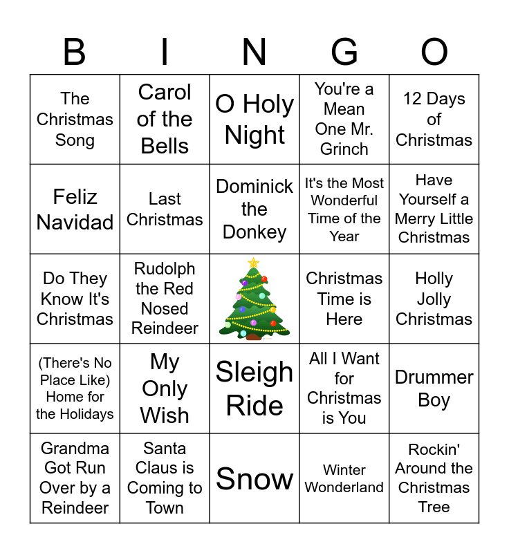 This bingo card has a free space and 29 words: Grandma Got Run Over by a Reindeer, It Feels Like Christmas, Rudolph the Red Nosed Reindeer, White Christmas, The Christmas Song, O Holy Night, Last Christmas, My Only Wish, Christmas Time is Here, Santa Claus is Coming to Town, Holly Jolly Christmas, Rockin' Around the Christmas Tree, Snow, Winter Wonderland, Have Yourself a Merry Little Christmas, Blue Christmas, Sleigh Ride, (There's No Place Like) Home for the Holidays, 12 Days of Christmas, Do They Know It's Christmas, All I Want for Christmas is You, Baby It's Cold Outside, It's the Most Wonderful Time of the Year, Feliz Navidad, You're a Mean One Mr. Grinch, Carol of the Bells, Drummer Boy, Dominick the Donkey and I Want a Hippopotamus for Christmas.