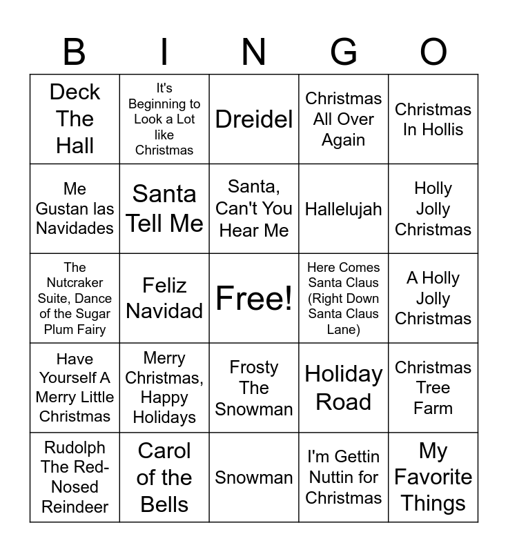 This bingo card has a free space and 69 words: (There's No Place Like) Home for the Holidays, A Holly Jolly Christmas, All I Want for Christmas Is You, Blue Christmas, Carol of the Bells, Christmas (Baby Please Come Home), Christmas All Over Again, Christmas Eve, Christmas In Hollis, Christmas Time Is Here, Christmas Tree Farm, Cozy Little Christmas, Deck The Hall, Dreidel, El Cuerpo Me Pide, Feliz Navidad, Frosty The Snowman, Hallelujah, Happy Holiday / The Holiday Season, Have Yourself A Merry Little Christmas, Here Comes Santa Claus (Right Down Santa Claus Lane), Holiday Road, Holly Jolly Christmas, I Am the Grinch, I Saw Mommy Kissing Santa Claus, I Want a Hippopotamus for Christmas, I'll be Home, I'll Be Home for Christmas, I'm Gettin Nuttin for Christmas, It's a Marshmallow World, It's Beginning to Look a Lot like Christmas, It's the Most Wonderful Time of the Year, Jingle Bell Rock, Jingle Bells, Last Christmas, Let It Snow! Let It Snow! Let It Snow!, Linus And Lucy, Little Saint Nick, Me Gustan las Navidades, Mele Kalikimaka (Merry Christmas), Merry Christmas, Happy Holidays, My Favorite Things, O Tannenbaum, Oh Hanukkah, Rockin' Around The Christmas Tree, Rudolph The Red-Nosed Reindeer, Run Rudolph Run, Santa Baby (with Henri René & His Orchestra), Santa Claus Is Comin' to Town, Santa Tell Me, Santa, Can't You Hear Me, Silver Bells, Sleigh Ride, Snowman, Step Into Christmas, The Chanukah Song, The Chipmunk Song (Christmas Don't Be Late), The Christmas Song (Merry Christmas To You), The Little Drummer Boy, The Nutcraker Suite, Dance of the Sugar Plum Fairy, This Christmas, Twelve Days Of Christmas, Underneath the Tree, We Need a Little Christmas, We Wish You a Merry Christmas, What Christmas Means To Me, Winter Wonderland, Wonderful Christmastime and You're A Mean One, Mr. Grinch.