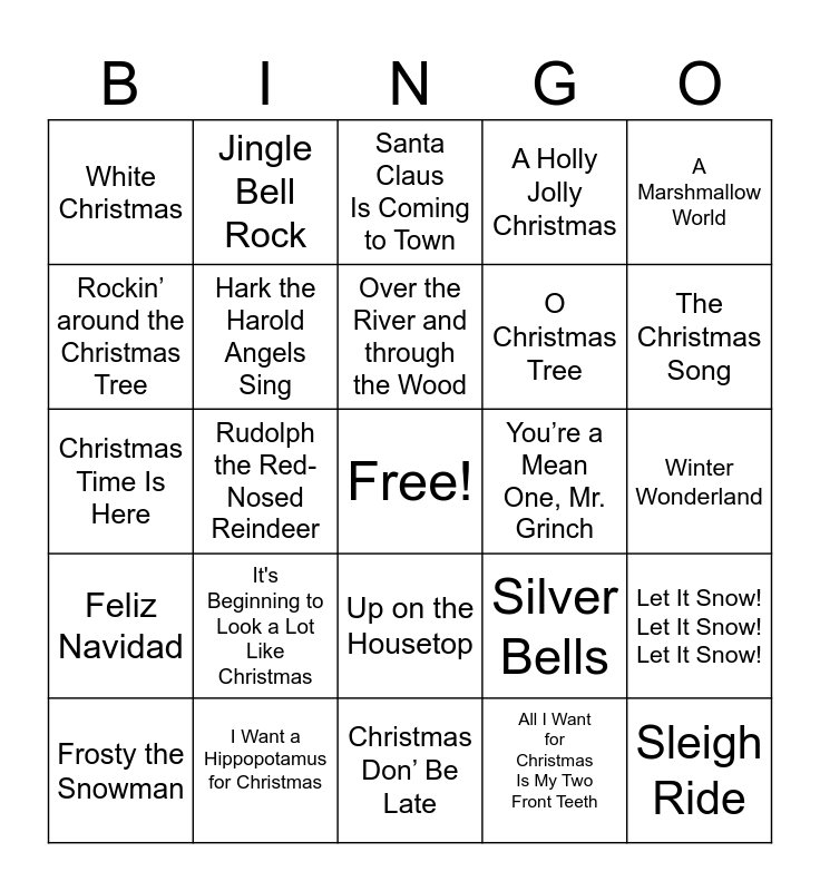 This bingo card has a free space and 24 words: It's Beginning to Look a Lot Like Christmas, I Want a Hippopotamus for Christmas, Over the River and through the Wood, Frosty the Snowman, A Marshmallow World, White Christmas, Rockin’ around the Christmas Tree, Jingle Bell Rock, You’re a Mean One, Mr. Grinch, Up on the Housetop, O Christmas Tree, Christmas Time Is Here, Silver Bells, Let It Snow! Let It Snow! Let It Snow!, Hark the Harold Angels Sing, All I Want for Christmas Is My Two Front Teeth, Winter Wonderland, Santa Claus Is Coming to Town, The Christmas Song, Rudolph the Red-Nosed Reindeer, Sleigh Ride, Feliz Navidad, A Holly Jolly Christmas and Christmas Don’ Be Late.