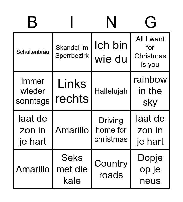 ⚠ This card has duplicate items: 1999 (2), I will survive (2), hutje op de hei (2), Johnny Däpp (2), Jodel jump (2), Jingle Bells (2), It's the most wonderfull time of the year (2), Ons moeder zeej nog (2), Nur noch shuhe an (2), Mama Lauda (2), Live is life (2), Links rechts (2), Last Christmas (2), laat de zon in je hart (2), Is this the way to Amarillo (2), immer wieder sonntags (2), Ich bin wie du (2), Atemlos durch die nacht (2), Hey, wir woll'n die Eisbären seh'n (2), Hey baby (2), Amalia (2), Helikopter (2), Hela Hola (2), Happy Xmas (war is over) (2), happy New Year (2), Hallelujah (2), All I want for Christmas is you (2), Flappie (2), Festival der liebe (2), Engelbewaarder (2), Dancing Queen (2), Wie kan mij vertellen… (2), viva Cerveza (2), Verdammt ich lieb'dich (2), Skandal im Sperrbezirk (2), Seks met die kale (2), Schultenbräu (2), Rosamunde (2), rainbow in the sky (2), Pretty Belinda (2), Driving home for christmas (2), Dopje op je neus (2), Country roads (2), Anton aus Tirol (2), Amarillo (2), Alice (2)