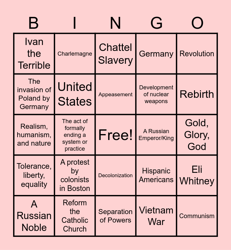 This bingo card has a free space and 34 words: The Assassination of Franz Ferdinand, Vietnam War, Napoleon, Protestant, Tolerance, liberty, equality, United States, Revolution, A Russian Noble, Charlemagne, South Africa, Appeasement, Chattel Slavery, Goods were made by machines & industries developed, Nazi Party, A Russian Emperor/King, Rebirth, Reform the Catholic Church, Realism, humanism, and nature, A protest by colonists in Boston, Hispanic Americans, Decolonization, Nationalism, Ivan the Terrible, Gold, Glory, God, Separation of Powers, Communism, Germany, Civil Rights Movement, Development of nuclear weapons, The invasion of Poland by Germany, A Parliament in France, The act of formally ending a system or practice, Eli Whitney and Social inequality and economic hardship.
