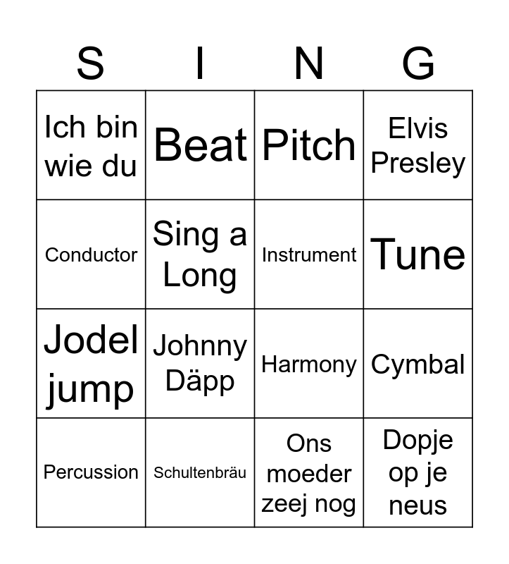 This bingo card has 77 words: Lyrics, The Beatles, Pitch, Orchestra, Cello, Saxophone, Piano, Accordion, Solo, Electric Guitar, Bagpipes, Flute, Tune, Sing a Long, Violin, Cymbal, The Beach Boys, Percussion, Trumpet, Conductor, Harmonica, Harmony, Instrument, Beat, Elvis Presley, Alto, A Capella, Soprano, Duet, The Rolling Stones, Pink Floyd, 1999, I will survive, hutje op de hei, Johnny Däpp, Jodel jump, Jingle Bells, It's the most wonderfull time of the year, Ons moeder zeej nog, Nur noch shuhe an, Mama Lauda, Live is life, Links rechts, Last Christmas, laat de zon in je hart, Is this the way to Amarillo, immer wieder sonntags, Ich bin wie du, Atemlos durch die nacht, Hey, wir woll'n die Eisbären seh'n, Hey baby, Amalia, Helikopter, Hela Hola, Happy Xmas (war is over), happy New Year, Hallelujah, All I want for Christmas is you, Flappie, Festival der liebe, Engelbewaarder, Dancing Queen, Wie kan mij vertellen…, viva Cerveza, Verdammt ich lieb'dich, Skandal im Sperrbezirk, Seks met die kale, Schultenbräu, Rosamunde, rainbow in the sky, Pretty Belinda, Driving home for christmas, Dopje op je neus, Country roads, Anton aus Tirol, Amarillo and Alice.