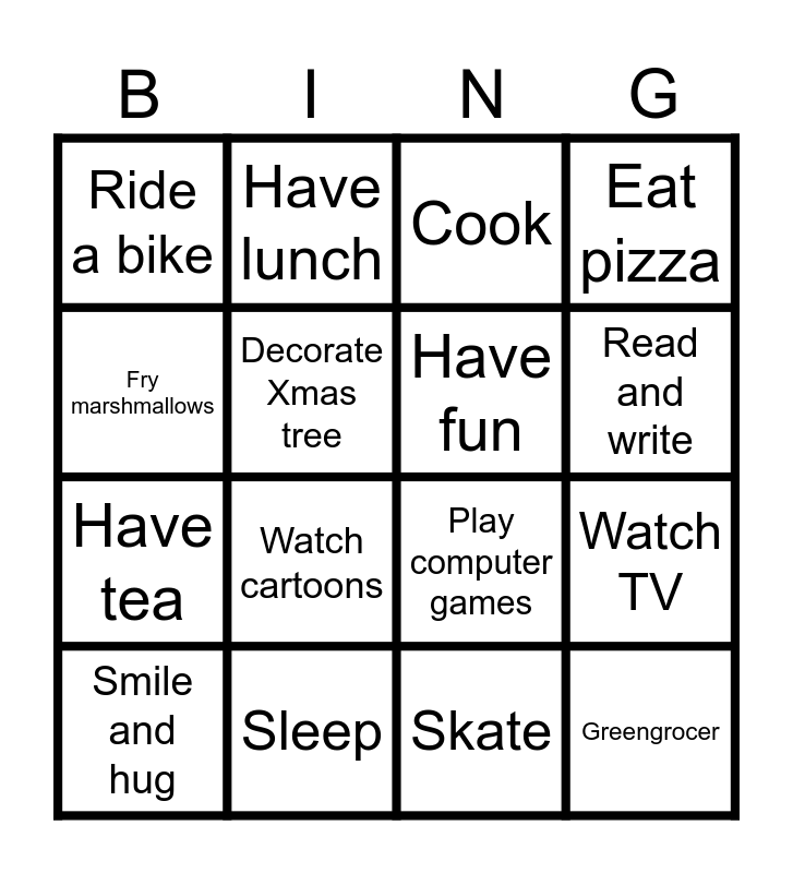 This bingo card has 16 words: Sleep, Watch TV, Cook, Ride a bike, Have tea, Have lunch, Play computer games, Skate, Fry marshmallows, Decorate Xmas tree, Smile and hug, Eat pizza, Watch cartoons, Read and write, Have fun and Greengrocer.