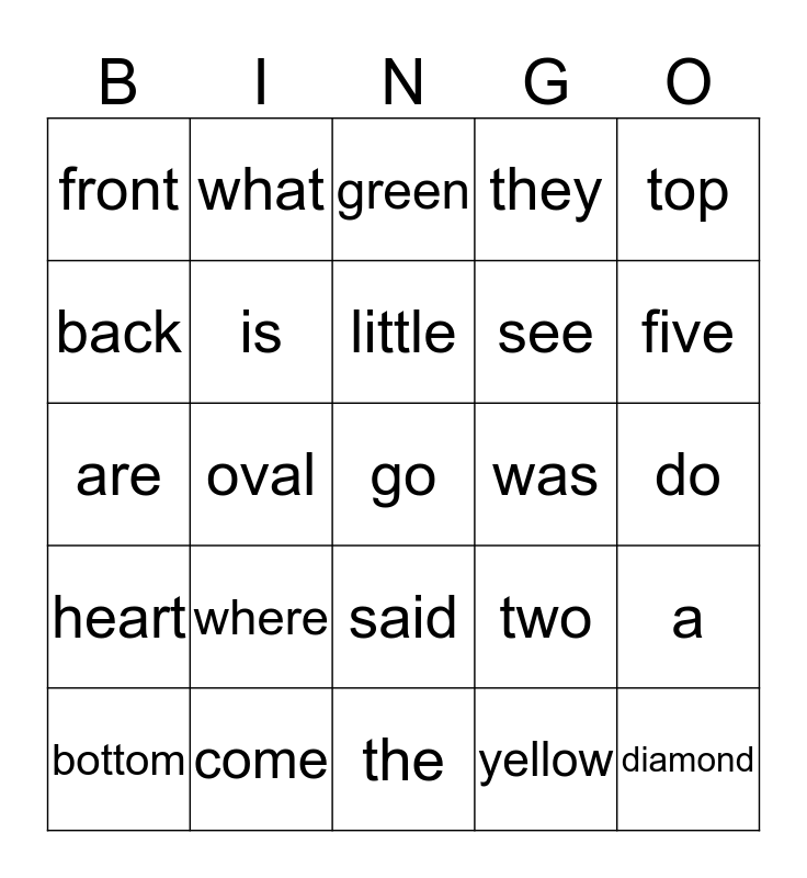 This bingo card has a free space and 24 words: where, come, little, bottom, top, front, back, what, was, said, see, are, two, a, is, yellow, do, green, five, oval, diamond, heart, they and the.