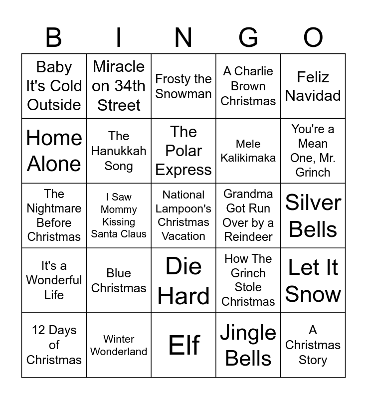 This bingo card has 30 words: Winter Wonderland, Rudolph the Red-Nosed Reindeer, I Saw Mommy Kissing Santa Claus, A Christmas Carol, Baby It's Cold Outside, Frosty the Snowman, The Hanukkah Song, Die Hard, Grandma Got Run Over by a Reindeer, Elf, Silver Bells, National Lampoon's Christmas Vacation, Jingle Bells, A Christmas Story, You're a Mean One, Mr. Grinch, The Chipmunk Song, How The Grinch Stole Christmas, It's a Wonderful Life, Blue Christmas, Feliz Navidad, The Nightmare Before Christmas, Do You Want to Build a Snowman?, Miracle on 34th Street, Mele Kalikimaka, Home Alone, A Charlie Brown Christmas, Let It Snow, 12 Days of Christmas, The Polar Express and I Want a Hippopotamus for Christmas.