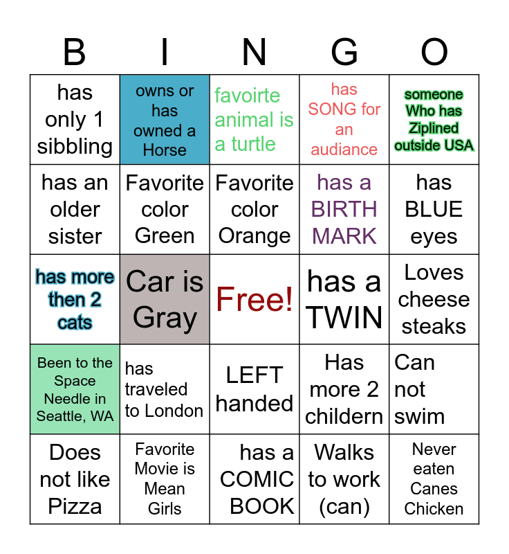 This bingo card has a free space and 24 words: Does not like Pizza, has traveled to London, Favorite color Orange, Walks to work (can), someone Who has Ziplined outside USA, has only 1 sibbling, owns or has owned a Horse, favoirte animal is a turtle, has a TWIN, Loves cheese steaks, has more then 2 cats, Favorite color Green, Has more 2 childern, Can not swim, has an older sister, Favorite Movie is Mean Girls, has a COMIC BOOK, has SONG for an audiance, has BLUE eyes, Been to the Space Needle in Seattle, WA, Car is Gray, LEFT handed, has a BIRTH MARK and Never eaten Canes Chicken.