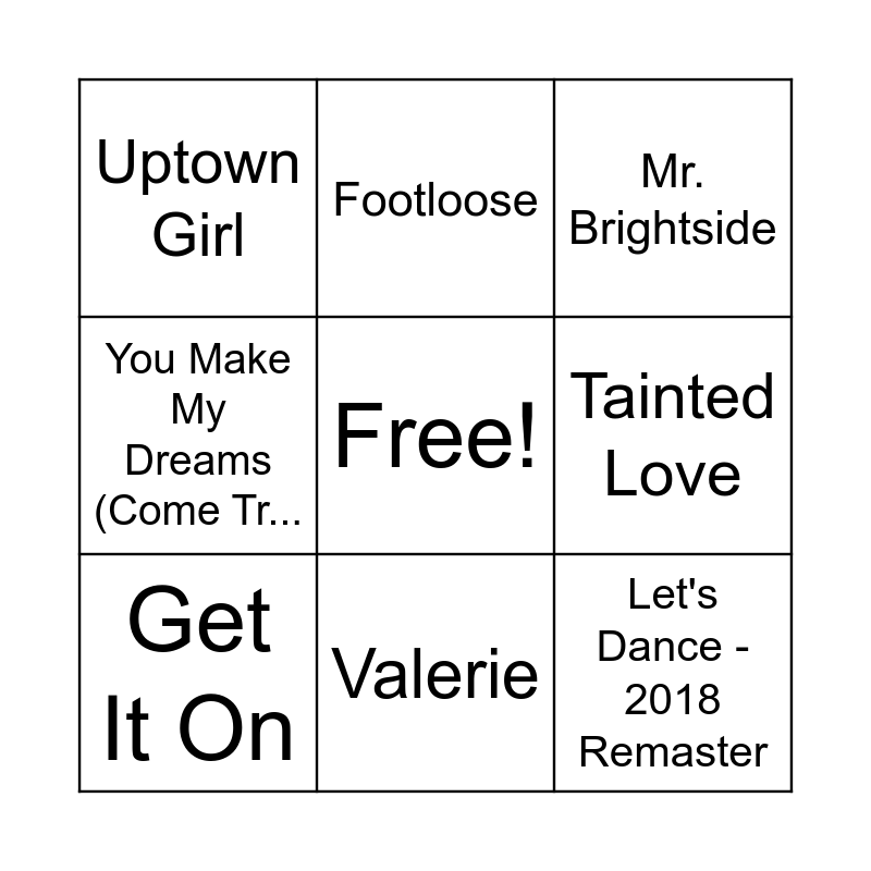 This bingo card has a free space and 80 words: I Believe in a Thing Called Love, Teenage Dirtbag, Mr. Brightside, Jessie's Girl, Rich Girl, Come On Eileen, You Shook Me All Night Long, Steal My Sunshine, Brass Monkey, Everywhere, Roxanne, Raspberry Beret, You Make My Dreams (Come Tr..., Uptown Girl, Play That Funky Music, Tainted Love, Age of Consent, Hip To Be Square, The Lovecats, Don't Stop Believin', Don't You Want Me, Let's Dance - 2018 Remaster, 9 to 5 • Music video, Valerie, Get It On, Under Pressure - Remastered 2011, Lovefool, Murder On The Dancefloor, Jump -, Wouldn't It Be Nice, Livin' On A Prayer C, Build Me Up Buttercup, You Can Call Me Al, Hollaback Girl, December, 1963, Walk Of Life, Superstition, You Spin Me Round, Good Vibrations, Walk Like an Egyptian, Twist And Shout, Dance Wiv Me, Hey Ya!, Kiss, Don't Stop Me Now - Remastered 2011, Footloose, Walk This Way, Don't Go Breaking My Heart, Sound Of The Underground, Into the Groove, Take A Chance On Me, Rehab, It's Tricky, Walking On Sunshine, Shut Up and Dance, Groove Is in the Heart, A Little Respect, Suspicious Minds, Gold, California Gurls, My Girl, Sir Duke, Just Dance, You Sexy Thing, Long Train Runnin', Give It Up, Young Hearts Run Free, Believe, More Than A Woman, I Wanna Dance with Somebody, Wake Me Up Before You Go-Go, I'm a Believer, Dancing Queen, Karma Chameleon, Keep On Movin', Wild Thing, Toxic, Touch The Sky, A Little Less Conversation and Feel the Love.