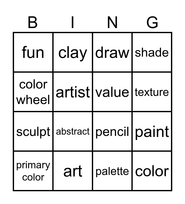 This bingo card has 16 words: art, paint, draw, fun, sculpt, clay, pencil, palette, color wheel, artist, primary color, shade, abstract, texture, value and color.