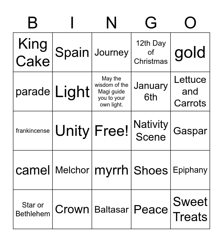 This bingo card has a free space and 24 words: Melchor, Crown, May the wisdom of the Magi guide you to your own light., Star or Bethlehem, gold, King Cake, parade, Spain, Nativity Scene, myrrh, January 6th, frankincense, Shoes, Epiphany, Light, Peace, Gaspar, Journey, Lettuce and Carrots, Unity, Sweet Treats, camel, 12th Day of Christmas and Baltasar.