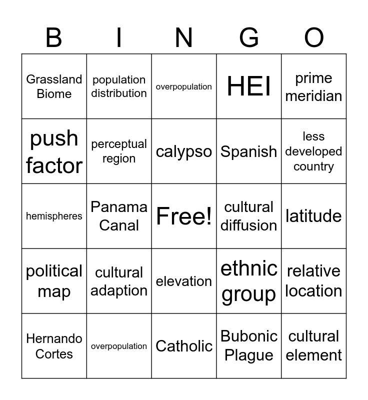 This bingo card has a free space and 24 words: cultural adaption, overpopulation, calypso, Hernando Cortes, prime meridian, Grassland Biome, push factor, population distribution, cultural diffusion, elevation, Spanish, hemispheres, ethnic group, relative location, perceptual region, Bubonic Plague, latitude, overpopulation, less developed country, Panama Canal, cultural element, political map, HEI and Catholic.