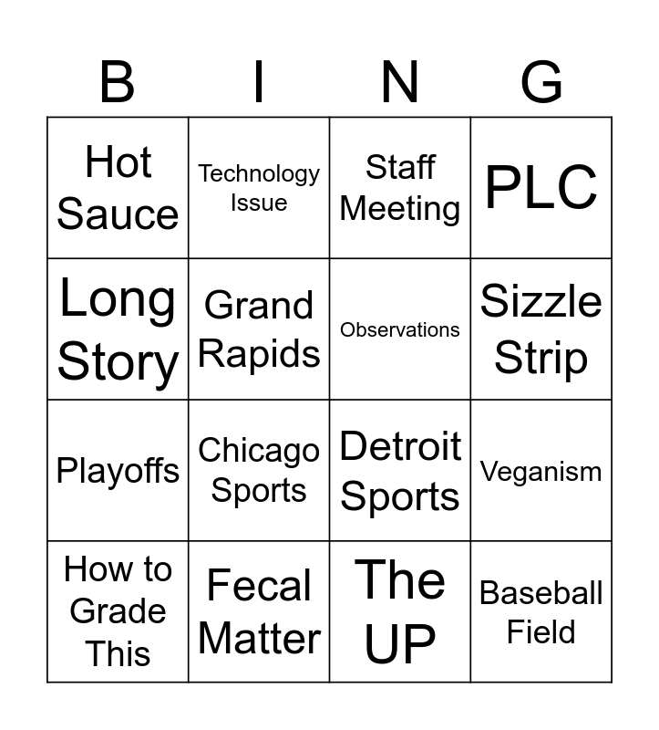This bingo card has 16 words: Fecal Matter, Veganism, Staff Meeting, Hot Sauce, Playoffs, Technology Issue, Detroit Sports, The UP, Long Story, Grand Rapids, How to Grade This, PLC, Chicago Sports, Sizzle Strip, Observations and Baseball Field.