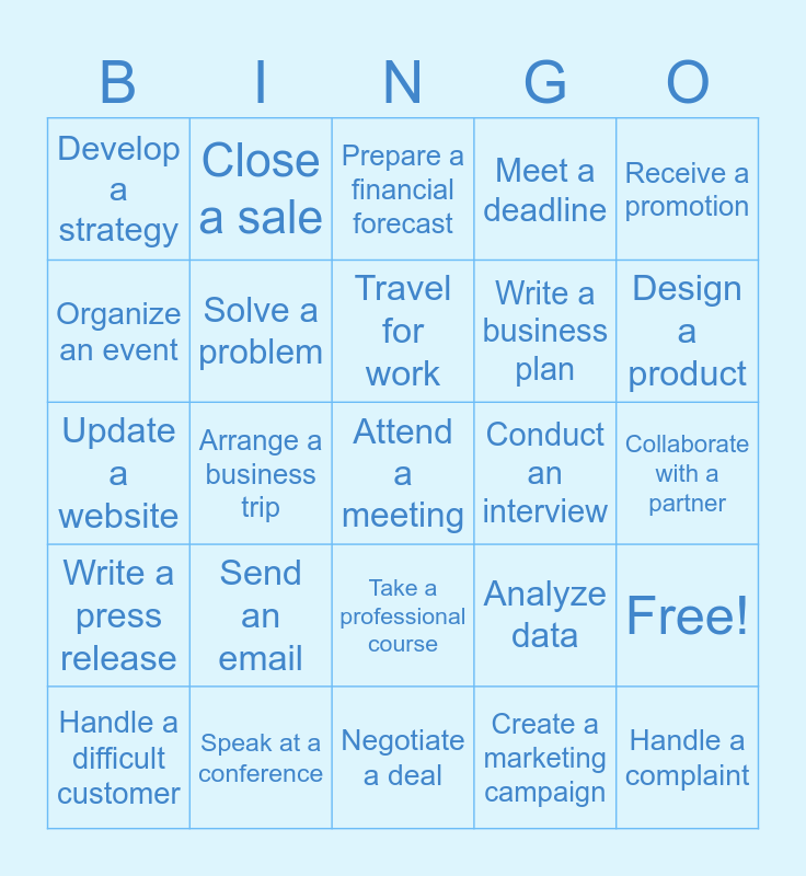 This bingo card has 50 words: Sign a contract, Attend a meeting, Deliver a presentation, Negotiate a deal, Send an email, Write a report, Close a sale, Manage a team, Organize an event, Train a new employee, Solve a problem, Meet a deadline, Free!, Analyze data, Review a proposal, Host a conference call, Travel for work, Conduct an interview, Lead a project, Receive a promotion, Arrange a business trip, Create a marketing campaign, Develop a strategy, Write a business plan, Use a new software, Handle a complaint, Design a product, Improve customer service, Prepare a financial forecast, Take a professional course, Work overtime, Hire a new employee, Visit a client, Attend a trade show, Speak at a conference, Delegate tasks, Manage a crisis, Conduct a survey, Build a professional network, Collaborate with a partner, Launch a new product, Reach a milestone, Give constructive feedback, Create a schedule, Handle a difficult customer, Update a website, Research a competitor, Brainstorm ideas, Write a press release and Publish an article.