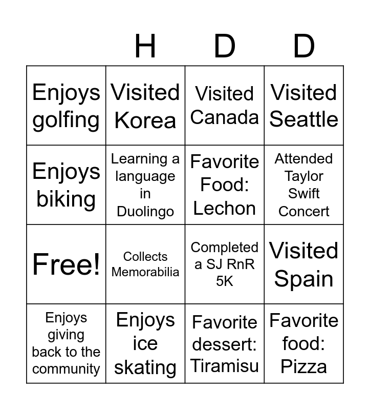 This bingo card has 20 words: Visited Spain, Visited Portugal, Visited Canada, Enjoys Swimming, Enjoys giving back to the community, Enjoys biking, Enjoys ice skating, Enjoys golfing, Free!, Visited Korea, Collects Memorabilia, Completed a SJ RnR 5K, Learning a language in Duolingo, Favorite food: Pizza, Favorite Food: Lechon, Favorite food: Burger, Attended Taylor Swift Concert, Visited Seattle, Favorite dessert: Tiramisu and Enjoys wineries.