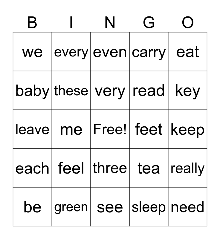 This bingo card has a free space and 29 words: be, he, me, she, we, even, these, feel, feet, green, keep, need, see, sleep, key, tree, three, each, eat, leave, tea, please, read, baby, carry, every, really, very and here.
