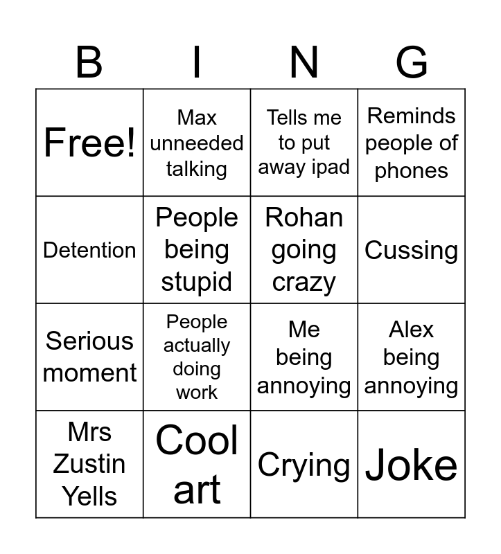 This bingo card has 16 words: Mrs Zustin Yells, Cool art, Tells me to put away ipad, Reminds people of phones, Detention, Max unneeded talking, Me being annoying, Alex being annoying, Free!, People being stupid, Crying, Cussing, Serious moment, People actually doing work, Rohan going crazy and Joke.