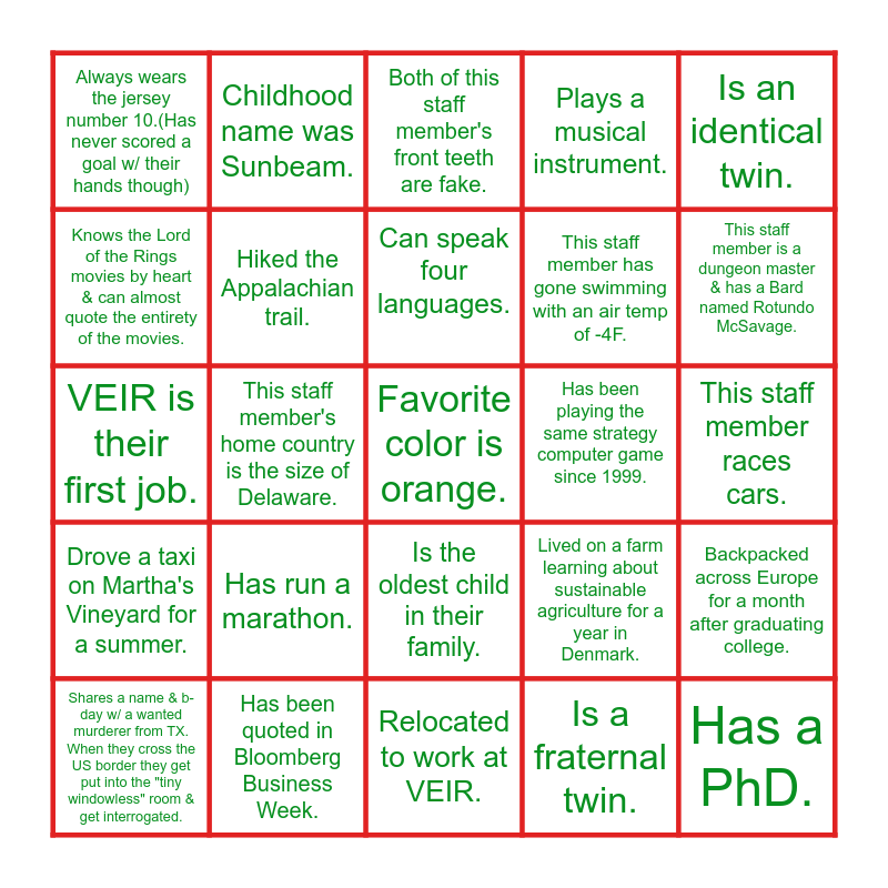 This bingo card has 25 words: Drove a taxi on Martha's Vineyard for a summer., Has been quoted in Bloomberg Business Week., Favorite color is orange., Is a fraternal twin., Is an identical twin., Always wears the jersey number 10.(Has never scored a goal w/ their hands though), Childhood name was Sunbeam., Both of this staff member's front teeth are fake., Has been playing the same strategy computer game since 1999., Backpacked across Europe for a month after graduating college., Knows the Lord of the Rings movies by heart & can almost quote the entirety of the movies., Hiked the Appalachian trail., Relocated to work at VEIR., Lived on a farm learning about sustainable agriculture for a year in Denmark., This staff member is a dungeon master & has a Bard named Rotundo McSavage., Shares a name & b-day w/ a wanted murderer from TX. When they cross the US border they get put into the "tiny windowless" room & get interrogated., This staff member's home country is the size of Delaware., Can speak four languages., This staff member has gone swimming with an air temp of -4F., This staff member races cars., VEIR is their first job., Has run a marathon., Is the oldest child in their family., Plays a musical instrument. and Has a PhD..