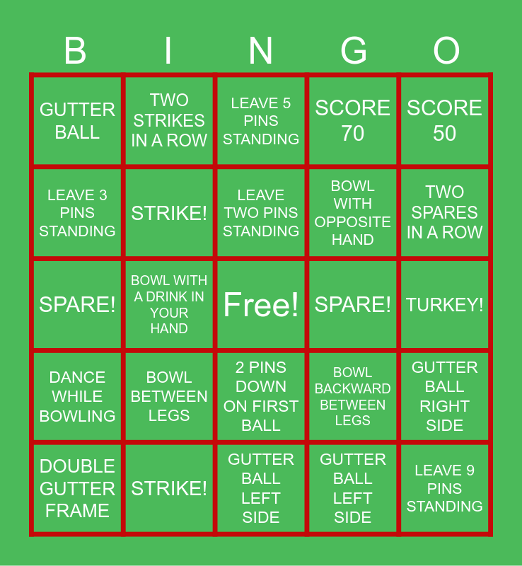 This bingo card has a free space and 24 words: BOWL BETWEEN LEGS, STRIKE!, LEAVE TWO PINS STANDING, DOUBLE GUTTER FRAME, SCORE 50, GUTTER BALL, LEAVE 3 PINS STANDING, TWO STRIKES IN A ROW, SPARE!, 2 PINS DOWN ON FIRST BALL, BOWL WITH OPPOSITE HAND, SPARE!, BOWL BACKWARD BETWEEN LEGS, GUTTER BALL RIGHT SIDE, STRIKE!, GUTTER BALL LEFT SIDE, TURKEY!, LEAVE 5 PINS STANDING, TWO SPARES IN A ROW, BOWL WITH A DRINK IN YOUR HAND, LEAVE 9 PINS STANDING, DANCE WHILE BOWLING, SCORE 70 and GUTTER BALL LEFT SIDE.
