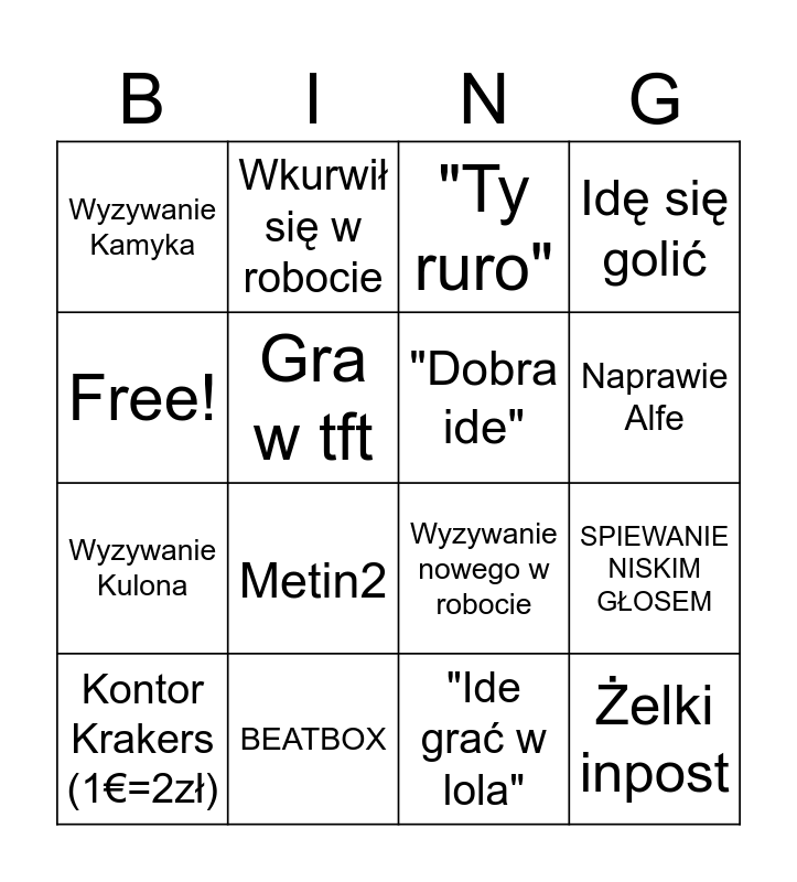 This bingo card has 16 words: BEATBOX, SPIEWANIE NISKIM GŁOSEM, "Ty ruro", Wyzywanie Kamyka, Wyzywanie Kulona, Wkurwił się w robocie, Wyzywanie nowego w robocie, "Ide grać w lola", Free!, Gra w tft, Kontor Krakers (1€=2zł), Idę się golić, Metin2, Naprawie Alfe, "Dobra ide" and Żelki inpost.