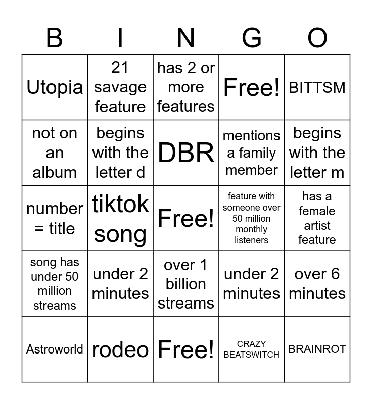This bingo card has a free space and 24 words: under 2 minutes, rodeo, DBR, Astroworld, BITTSM, Utopia, not on an album, 21 savage feature, feature with someone over 50 million monthly listeners, over 1 billion streams, mentions a family member, number = title, under 2 minutes, over 6 minutes, begins with the letter d, CRAZY BEATSWITCH, has a female artist feature, has 2 or more features, begins with the letter m, tiktok song, BRAINROT, song has under 50 million streams, Free! and Free!.