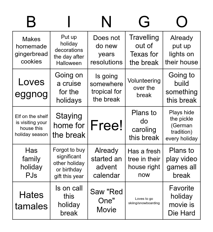 This bingo card has a free space and 24 words: Forgot to buy significant other holiday or birthday gift this year, Is on call this holiday break, Is going somewhere tropical for the break, Hates tamales, Already put up lights on their house, Makes homemade gingerbread cookies, Loves eggnog, Put up holiday decorations the day after Halloween, Plans to do caroling this break, Already started an advent calendar, Volunteering over the break, Elf on the shelf is visiting your house this holiday season, Has a fresh tree in their house right now, Plans to play video games all break, Going on a cruise for the holidays, Loves to go skiing/snowboarding, Plays hide the pickle (German tradition) every holiday, Does not do new years resolutions, Going to build something this break, Staying home for the break, Favorite holiday movie is Die Hard, Has family holiday PJs, Travelling out of Texas for the break and Saw "Red One" Movie.