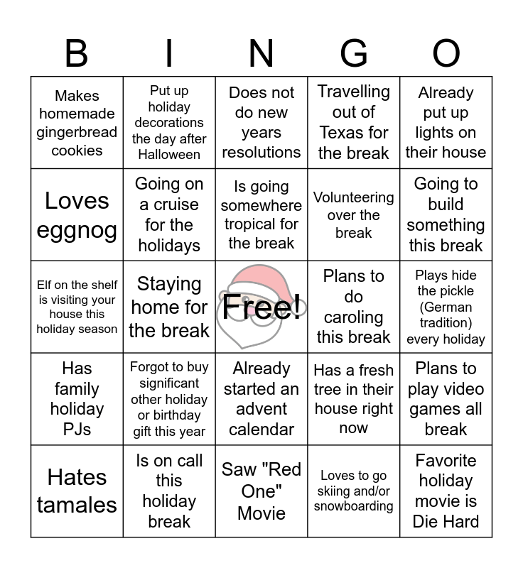 This bingo card has a free space and 24 words: Forgot to buy significant other holiday or birthday gift this year, Is on call this holiday break, Is going somewhere tropical for the break, Hates tamales, Already put up lights on their house, Makes homemade gingerbread cookies, Loves eggnog, Put up holiday decorations the day after Halloween, Plans to do caroling this break, Already started an advent calendar, Volunteering over the break, Elf on the shelf is visiting your house this holiday season, Has a fresh tree in their house right now, Plans to play video games all break, Going on a cruise for the holidays, Loves to go skiing and/or snowboarding, Plays hide the pickle (German tradition) every holiday, Does not do new years resolutions, Going to build something this break, Staying home for the break, Favorite holiday movie is Die Hard, Has family holiday PJs, Travelling out of Texas for the break and Saw "Red One" Movie.