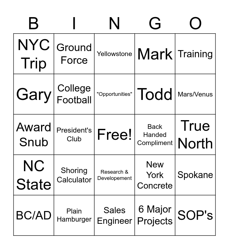 This bingo card has a free space and 29 words: BC/AD, Rudy's 15 Year, President's Club, Chick-fil-A, NYC Trip, Yellowstone, College Football, Shoring Calculator, Back Handed Compliment, Plain Hamburger, True North, SOP's, Sales Engineer, 6 Major Projects, Mars/Venus, Team Judy, Research & Developement, NC State, Training, Award Snub, New York Concrete, Design Manual, Todd, Gary, Mark, Ground Force, Spokane, "Opportunities" and 5+ New EIT's.