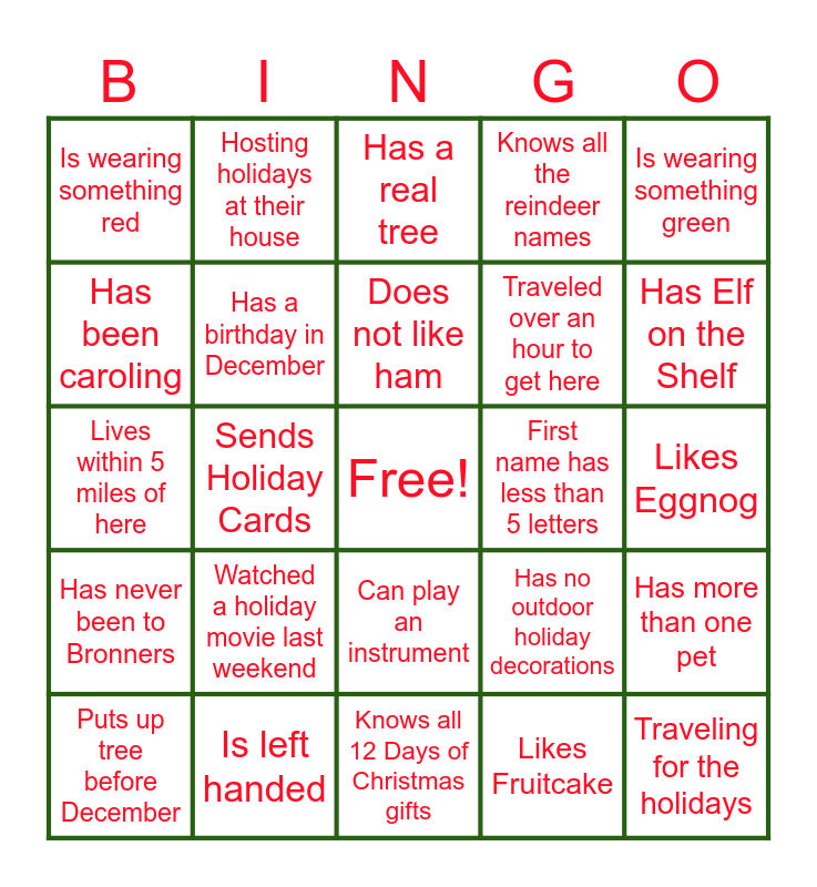 This bingo card has a free space and 24 words: Watched a holiday movie last weekend, Is left handed, Does not like ham, Puts up tree before December, Is wearing something green, Is wearing something red, Has been caroling, Hosting holidays at their house, First name has less than 5 letters, Can play an instrument, Traveled over an hour to get here, Lives within 5 miles of here, Has no outdoor holiday decorations, Has more than one pet, Has a birthday in December, Likes Fruitcake, Likes Eggnog, Has a real tree, Has Elf on the Shelf, Sends Holiday Cards, Traveling for the holidays, Has never been to Bronners, Knows all the reindeer names and Knows all 12 Days of Christmas gifts.