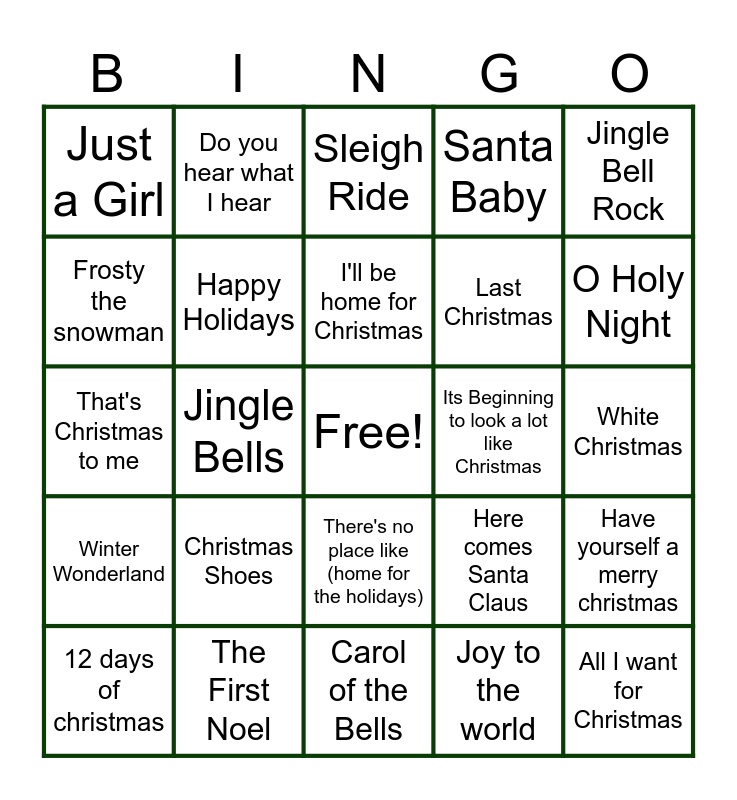 This bingo card has a free space and 52 words: A holly jolly Christmas, All I want for Christmas, Blue Christmas, Carol of the Bells, Christmas Shoes, Deck the hall, Do you hear what I hear, Feliz Navidad, Frosty the snowman, Grandma got run over by a reindeer, Happy Holidays, Hark the Herald Angels Sing, Have yourself a merry christmas, Here comes Santa Claus, I saw Mommy Kissing Santa Claus, I want a Hippopotamus for Christmas, I'll be home for Christmas, Its Beginning to look a lot like Christmas, It's the most wonderful time of year, Jingle Bell Rock, Jingle Bells, Joy to the world, Just a Girl, Last Christmas, Let it snow, Little Drummer Boy, Mary Did you know, O Christmas Tree, O Holy Night, Rockin' around the Christmas tree, Rudolph the red nosed Reindeer, Santa Baby, Santa Claus is coming to town, Silent Night, Silver Bells, Sleigh Ride, The First Noel, We need a little Christmas, What child is This, What Christmas means to me, Where are you Christmas, White Christmas, Winter Wonderland, You're a mean one Mr. Grinch, There's no place like (home for the holidays), We wish you a Merry Christmas, Run Run Rudolph, That's Christmas to me, O Come, All Ye Faithful, Up on the Housetop, 12 days of christmas and Grown up christmas list.