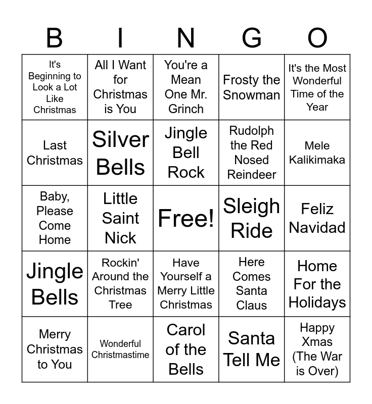 This bingo card has a free space and 25 words: Rockin' Around the Christmas Tree, Carol of the Bells, Jingle Bell Rock, Merry Christmas to You, It's the Most Wonderful Time of the Year, It's Beginning to Look a Lot Like Christmas, Last Christmas, All I Want for Christmas is You, Sleigh Ride, Have Yourself a Merry Little Christmas, Rudolph the Red Nosed Reindeer, Baby, Please Come Home, Here Comes Santa Claus, Home For the Holidays, Silver Bells, What Christmas Means to Me, Feliz Navidad, You're a Mean One Mr. Grinch, Mele Kalikimaka, Little Saint Nick, Happy Xmas (The War is Over), Wonderful Christmastime, Jingle Bells, Frosty the Snowman and Santa Tell Me.