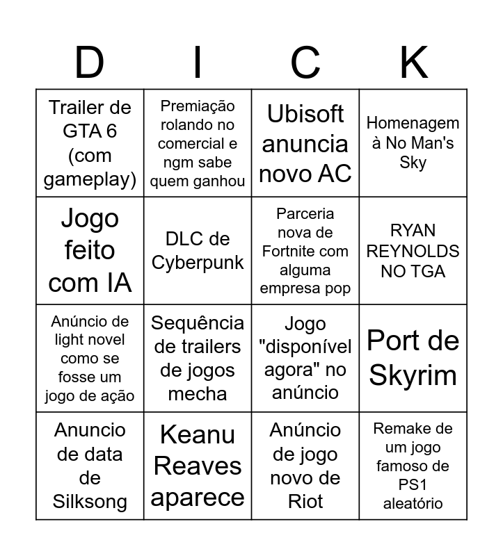 This bingo card has 16 words: Keanu Reaves aparece, Port de Skyrim, Ubisoft anuncia novo AC, Trailer de GTA 6 (com gameplay), Anúncio de light novel como se fosse um jogo de ação, Premiação rolando no comercial e ngm sabe quem ganhou, Jogo "disponível agora" no anúncio, Anúncio de jogo novo de Riot, Jogo feito com IA, DLC de Cyberpunk, Anuncio de data de Silksong, Homenagem à No Man's Sky, Sequência de trailers de jogos mecha, RYAN REYNOLDS NO TGA, Parceria nova de Fortnite com alguma empresa pop and Remake de um jogo famoso de PS1 aleatório.