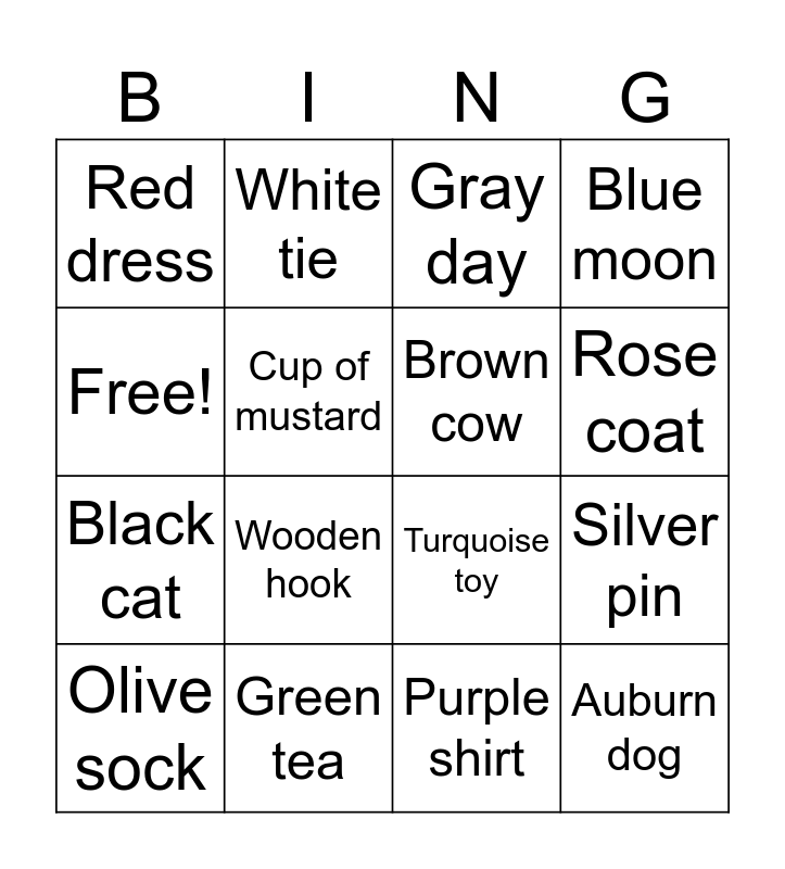 This bingo card has 16 words: Green tea, Silver pin, Gray day, Red dress, Black cat, White tie, Turquoise toy, Purple shirt, Free!, Cup of mustard, Olive sock, Blue moon, Wooden hook, Rose coat, Brown cow and Auburn dog.