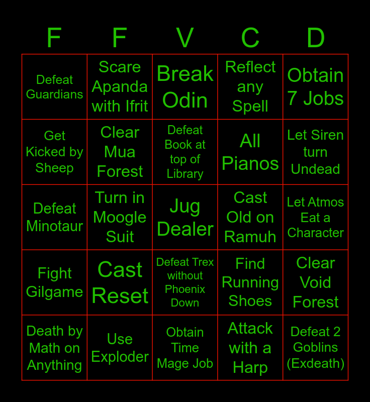 This bingo card has a free space and 24 words: Cast Reset, Use Exploder, Defeat Book at top of Library, Death by Math on Anything, Obtain 7 Jobs, Defeat Guardians, Get Kicked by Sheep, Scare Apanda with Ifrit, Cast Old on Ramuh, Defeat Trex without Phoenix Down, All Pianos, Defeat Minotaur, Find Running Shoes, Clear Void Forest, Clear Mua Forest, Attack with a Harp, Let Atmos Eat a Character, Break Odin, Let Siren turn Undead, Turn in Moogle Suit, Defeat 2 Goblins (Exdeath), Fight Gilgame, Reflect any Spell and Obtain Time Mage Job.
