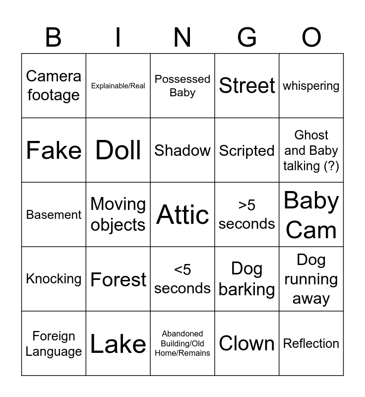 This bingo card has a free space and 24 words: Forest, Lake, Shadow, Foreign Language, whispering, Camera footage, Fake, Explainable/Real, >5 seconds, <5 seconds, Scripted, Basement, Dog barking, Dog running away, Doll, Clown, Baby Cam, Possessed Baby, Ghost and Baby talking (?), Moving objects, Reflection, Knocking, Street and Abandoned Building/Old Home/Remains.