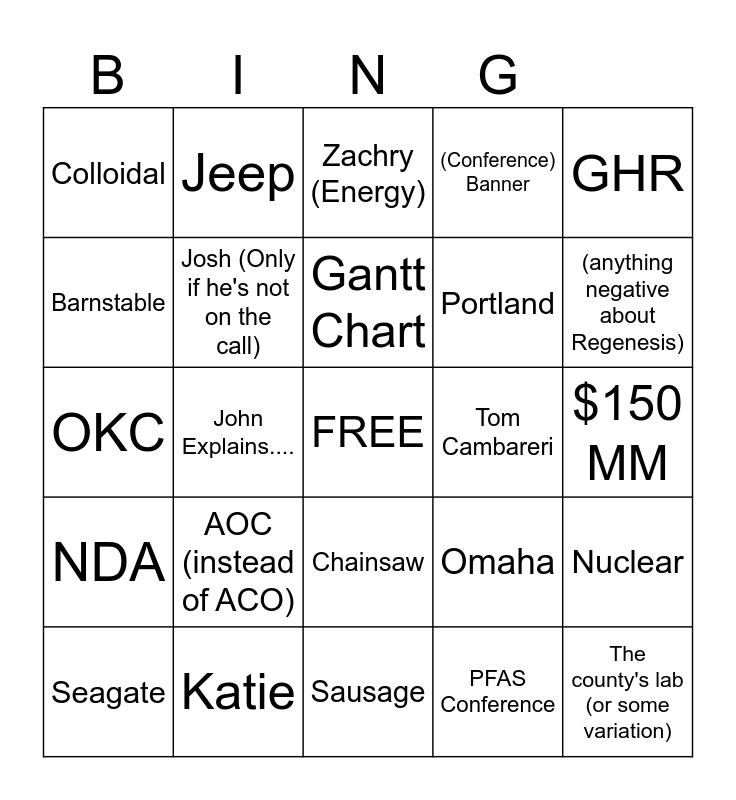 This bingo card has a free space and 25 words: AOC (instead of ACO), Sausage, Gantt Chart, Seagate, GHR, Colloidal, Barnstable, Jeep, Tom Cambareri, Chainsaw, Portland, OKC, Omaha, Nuclear, Josh (Only if he's not on the call), Bill Gates, $150 MM, Zachry (Energy), (anything negative about Regenesis), John Explains...., The county's lab (or some variation), Katie, NDA, (Conference) Banner and PFAS Conference.