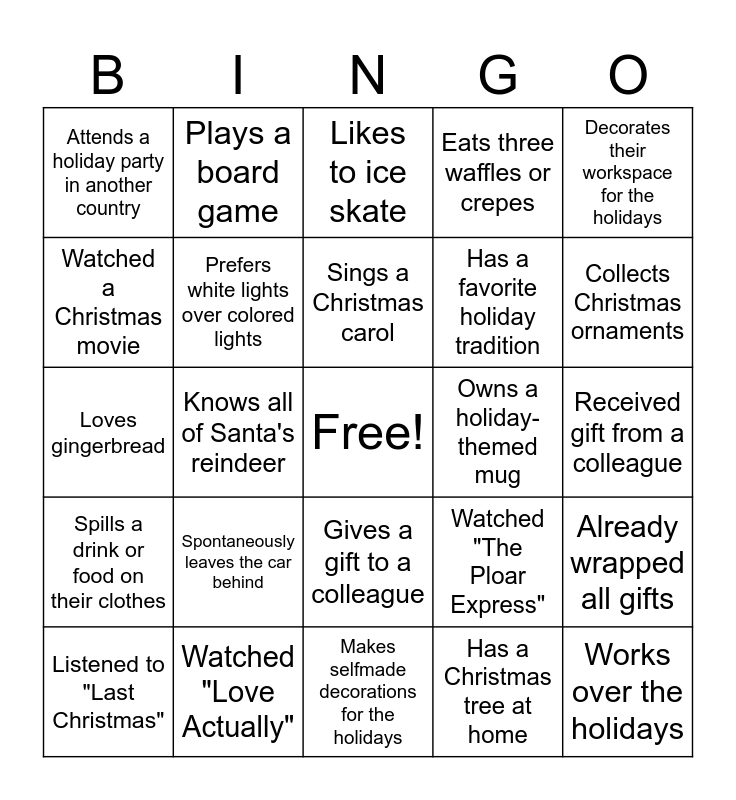 This bingo card has a free space and 65 words: Is still in probation period, Is rarely in the office, Is at the Office almost everyday, Already wrapped all gifts, Baked cookies, Eats a candy cane, Plays a board game, Wears a Christmas sweater, Sings a Christmas carol, Shares a funny holiday story, Gives a gift to a colleague, Dresses their pets in Christmas outfits, Received gift from a colleague, Decorates their workspace for the holidays, Knows how to make eggnog, Watched a Christmas movie, Knows all of Santa's reindeer, Attends a holiday party in another country, Prefers giving gifts over receiving them, Has a favorite holiday tradition, Spontaneously leaves the car behind, Spills a drink or food on their clothes, Eats three waffles or crepes, Drinks mulled wine, Takes a selfie, Wears a festive outfit, Is the first one at the buffet, Paints a mug, Works over the holidays, Has been at VMRay for over five years, Listened to "Last Christmas", Listened to "Jingle Bells", Listened to "All I want for Christmas is you", Watched "Home Alone", Watched "The Ploar Express", Watched "Love Actually", Watched "The Grinch", Loves gingerbread, Has a Christmas tree at home, Sings a Christmas carol, Prefers white lights over colored lights, Eats chocolate fruits, Owns a holiday-themed mug, Enjoys watching holiday baking shows, Travels during the holidays, Likes to volunteer during the holiday season, Collects Christmas ornaments, Collects Christmas Globes, Takes holiday photos with Santa Claus, Enjoys hot chocolate with marshmallows, Sends out holiday cards this year, Knows how to say "Merry Christmas" in 3 different languages, Watches holiday shows on TV, Makes selfmade decorations for the holidays, Enjoys playing holiday-themed games (like charades), Built a snowman, Likes so ski or snowboard, Likes to ice skate, Is on winter vacation this year, Is travelling somewhere warm this winter, Made a snowangel, Saw snow this year, Prefers celebrating New Year's Eve over Christmas, Takes group photos in front of the Christmas tree and Visited a christmas market.