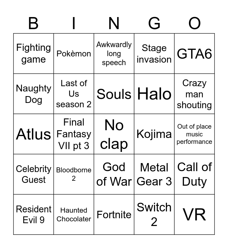 This bingo card has 25 words: Bloodborne 2, Fortnite, Souls, Resident Evil 9, GTA6, Fighting game, Naughty Dog, Pokèmon, Kojima, God of War, Halo, Atlus, Metal Gear 3, Call of Duty, Last of Us season 2, VR, Out of place music performance, Awkwardly long speech, Crazy man shouting, Final Fantasy VII pt 3, No clap, Haunted Chocolater, Celebrity Guest, Stage invasion and Switch 2.