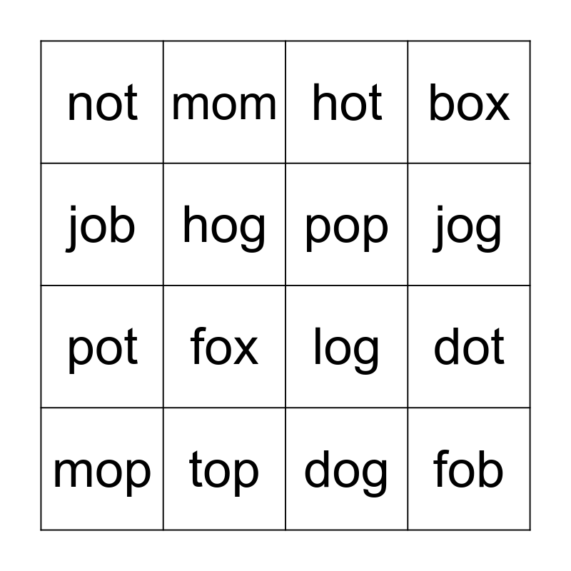 This bingo card has 16 words: top, dot, hot, not, pot, mom, log, dog, job, hog, mop, box, fox, jog, pop and fob.