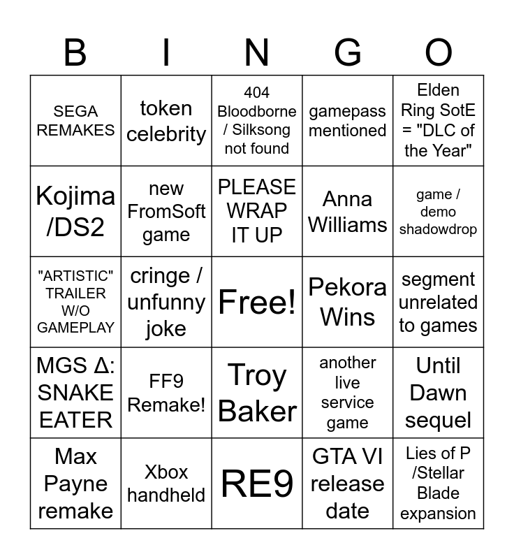 This bingo card has a free space and 24 words: FF9 Remake!, Xbox handheld, PLEASE WRAP IT UP, Max Payne remake, Elden Ring SotE = "DLC of the Year", SEGA REMAKES, Kojima /DS2, token celebrity, Pekora Wins, Troy Baker, Anna Williams, "ARTISTIC" TRAILER W/O GAMEPLAY, another live service game, Until Dawn sequel, new FromSoft game, GTA VI release date, segment unrelated to games, 404 Bloodborne / Silksong not found, game / demo shadowdrop, cringe / unfunny joke, Lies of P /Stellar Blade expansion, MGS Δ: SNAKE EATER, gamepass mentioned and RE9.