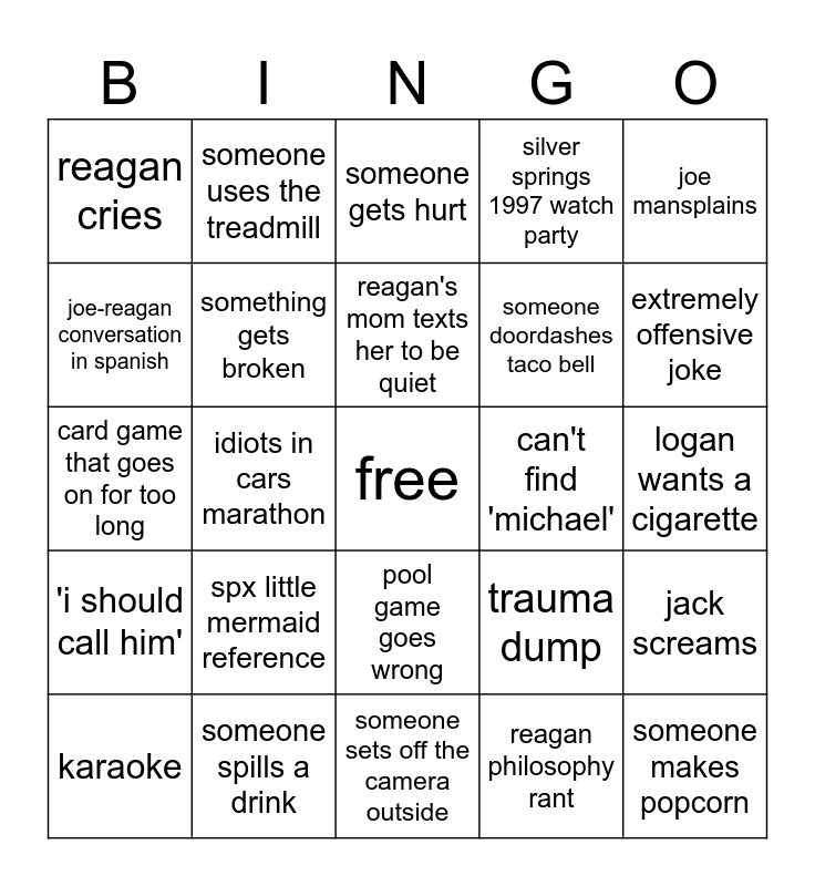 This bingo card has a free space and 24 words: spx little mermaid reference, someone spills a drink, reagan's mom texts her to be quiet, karaoke, joe mansplains, reagan cries, joe-reagan conversation in spanish, someone uses the treadmill, can't find 'michael', pool game goes wrong, someone doordashes taco bell, card game that goes on for too long, trauma dump, jack screams, something gets broken, reagan philosophy rant, logan wants a cigarette, someone gets hurt, extremely offensive joke, idiots in cars marathon, someone makes popcorn, 'i should call him', silver springs 1997 watch party and someone sets off the camera outside.