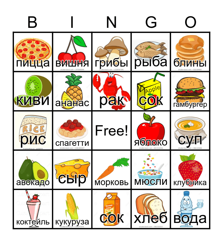 This bingo card has 31 images, a free space and 31 words: сок, брокколи, спагетти, бананы, пицца, грибы, ананас, мюсли, яблоко, хлеб, суп, вода, курица, картошка, гамбургер, виноград, клубника, сыр, авокадо, морковь, блины, молоко, коктейль, вишня, сок, киви, рыба, рис, кукуруза, рак and перец.