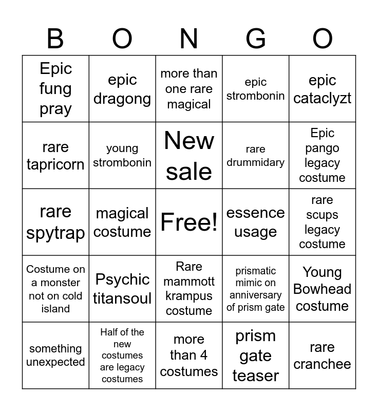This bingo card has a free space and 24 words: Psychic titansoul, Half of the new costumes are legacy costumes, New sale, something unexpected, epic cataclyzt, Epic fung pray, rare tapricorn, epic dragong, essence usage, Rare mammott krampus costume, rare drummidary, rare spytrap, prismatic mimic on anniversary of prism gate, Young Bowhead costume, young strombonin, prism gate teaser, rare scups legacy costume, more than one rare magical, Epic pango legacy costume, magical costume, rare cranchee, Costume on a monster not on cold island, epic strombonin and more than 4 costumes.