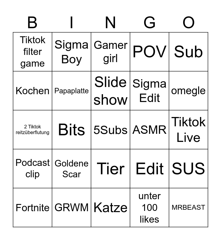 This bingo card has a free space and 24 words: Goldene Scar, GRWM, Slide show, Fortnite, Sub, Tiktok filter game, Kochen, Sigma Boy, ASMR, Tier, Sigma Edit, 2 Tiktok reitzüberflutung, Edit, SUS, Papaplatte, unter 100 likes, Tiktok Live, Gamer girl, omegle, Bits, MRBEAST, Podcast clip, POV and Katze.