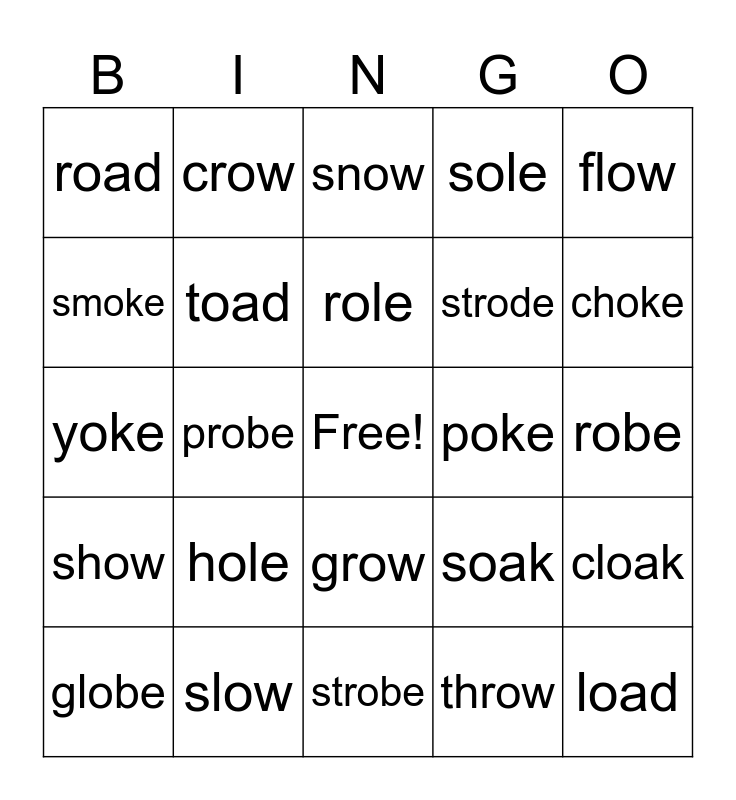This bingo card has a free space and 35 words: code, mode, rode, strode, load, road, toad, joke, poke, woke, yoke, crow, grow, glow, flow, show, slow, snow, throw, robe, globe, probe, strobe, broke, choke, smoke, spoke, oak, soak, cloak, croak, hole, role, sole and whole.